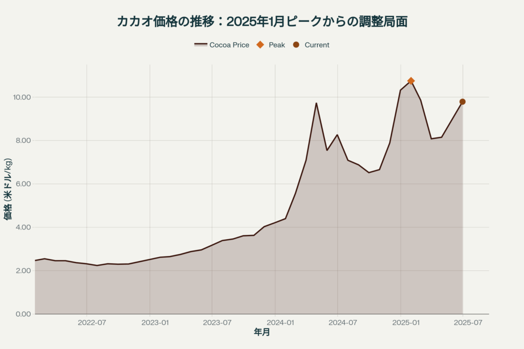 国際カカオ価格は2025年1月に1kgあたり10.75ドルでピークを迎えた後、いったん調整を経たが依然として高止まり状態にある。2022年初頭と比べると、実に4倍以上の価格水準を維持している。