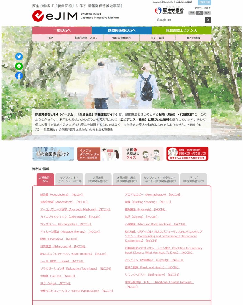 主な内容・特徴:厚生労働省による「統合医療」(補完・代替医療)情報の発信サイトです。ハーブやサプリ、民間療法など代替療法と科学的根拠の関係についてエビデンスに基づいた情報を提供しています。「情報の見極め方(一般の方へ)」というページでは、インターネット上の医療情報を吟味する具体的なポイントやクイズ形式の教材も掲載されています。