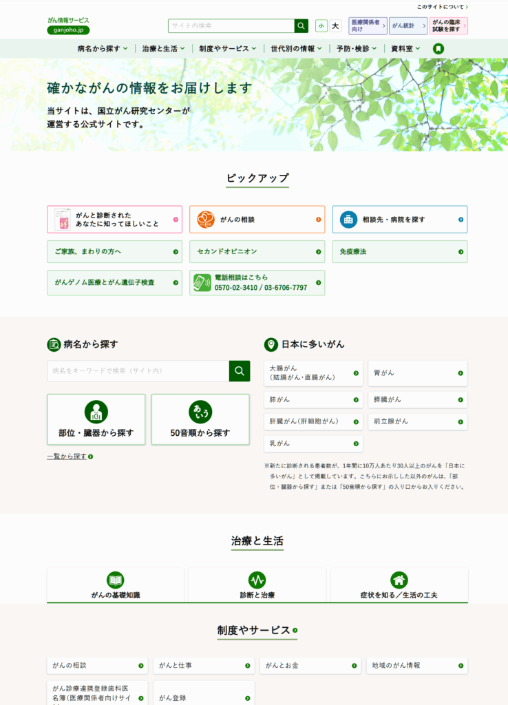 主な内容・特徴:日本で最も信頼性が高いがん専門情報ポータルです。国立がん研究センターが運営し、患者や家族を中心に一般、医療者、行政担当者まで広く利用されています。各種がんの解説、標準治療、臨床試験情報、統計データ、相談窓口など、「確かな」情報を網羅的に提供しており、月間数百万人が利用しています。