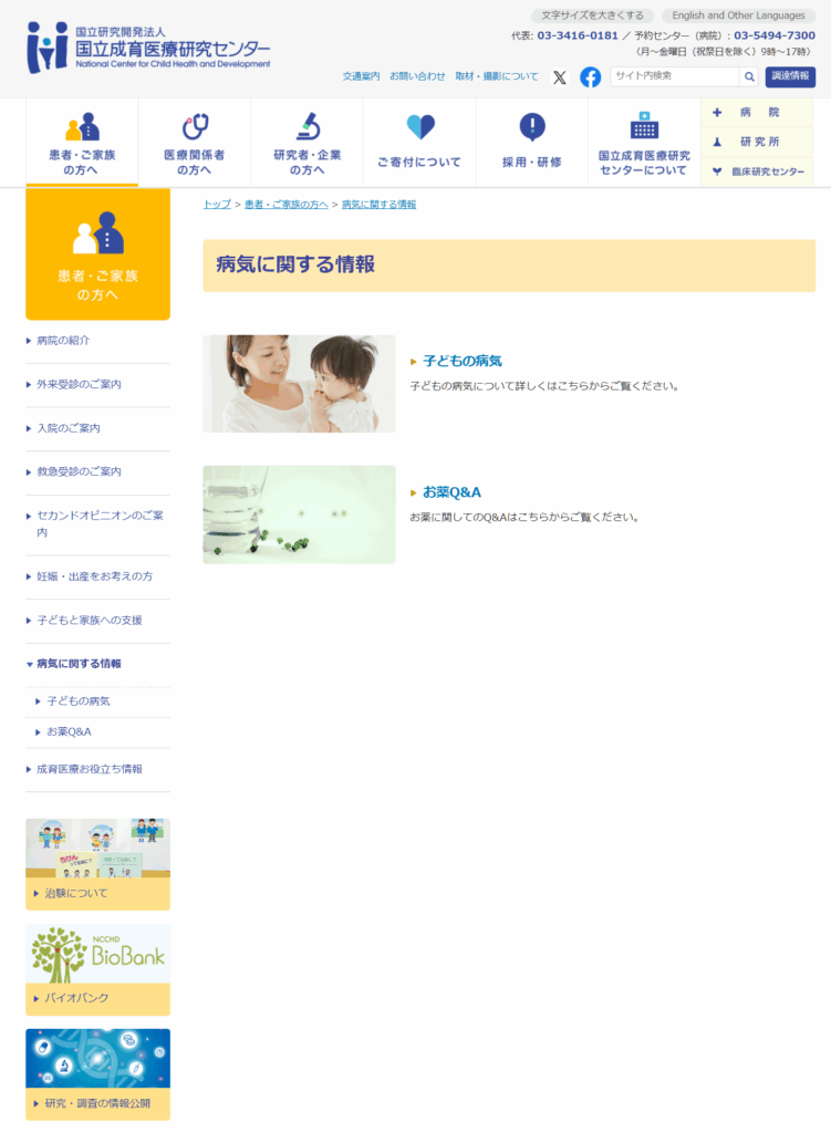 主な内容・特徴:日本の小児医療の中核である国立成育医療研究センターが提供する、子どもの病気に関する情報ページです。50音順の病名索引から、小児疾患の解説・症状・治療法・ケア方法などを専門医がわかりやすく説明しています。難しい病名から日常よく遭遇する症状まで網羅され、保護者がお子さんの病気を理解するのに役立つ内容です。
