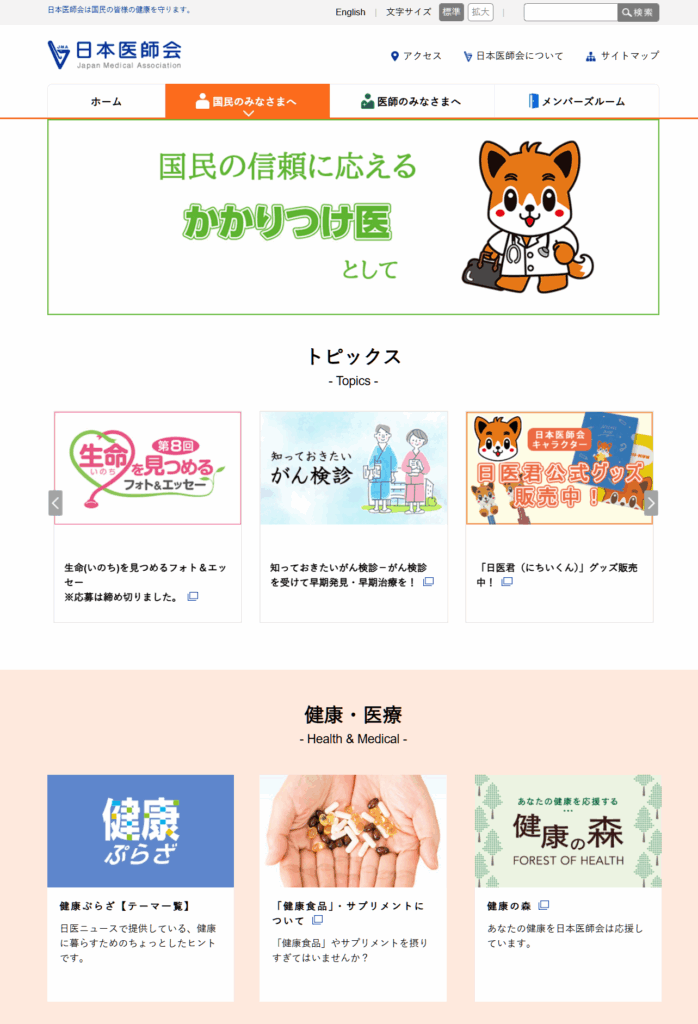 主な内容・特徴:日本医師会が一般の方向けに運営する公式サイトの情報ページです。医療・健康に関するニュース、正しい知識の普及を目的としたコラム、病気予防や検診啓発、医療制度の解説など、多彩なコンテンツがあります。医師会発行の「日医ニュース」から抜粋した健康情報(健康ぷらざ)や、子どもの健康相談(白クマ先生の子ども診療所)、サプリメントの注意点など専門家監修の記事が掲載されています。