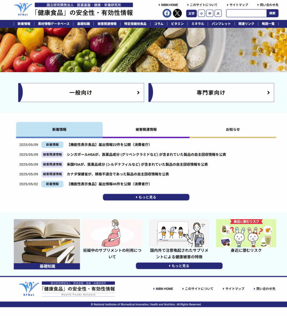 主な内容・特徴:「健康食品」(いわゆるサプリメントや機能性食品)の効果や安全性について科学的根拠をまとめたデータベースです。国立健康・栄養研究所が運営しており、食品成分に関する正しい情報提供や健全な食生活の推進、健康食品による健康被害防止を主目的として運営されています。具体的には各素材(例えば○○というハーブ)の有効性に関する論文レビュー結果や、安全性に関する評価、他の薬剤との相互作用の有無などが閲覧できます。専門家向けの詳細データから、一般向けの基礎知識、関連コラム、Q&A、パンフレットまで情報は豊富です。