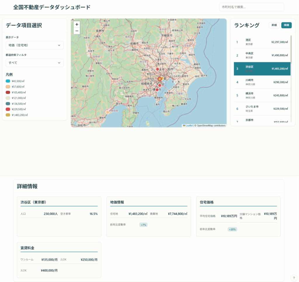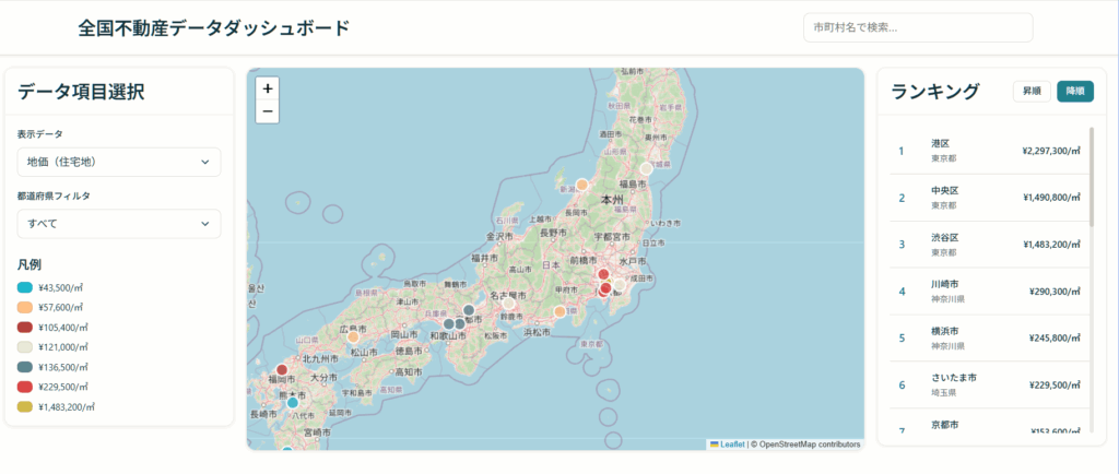 全国市町村別に、平均住宅価格や分譲マンションの価格、賃貸住宅の賃料レンジ、地価、空き家率がランキングで比較表示できるウェブアプリは作れるか。インターフェースにはマップも表示して選択した項目データによる色塗りレイヤーがあるとなおよい。