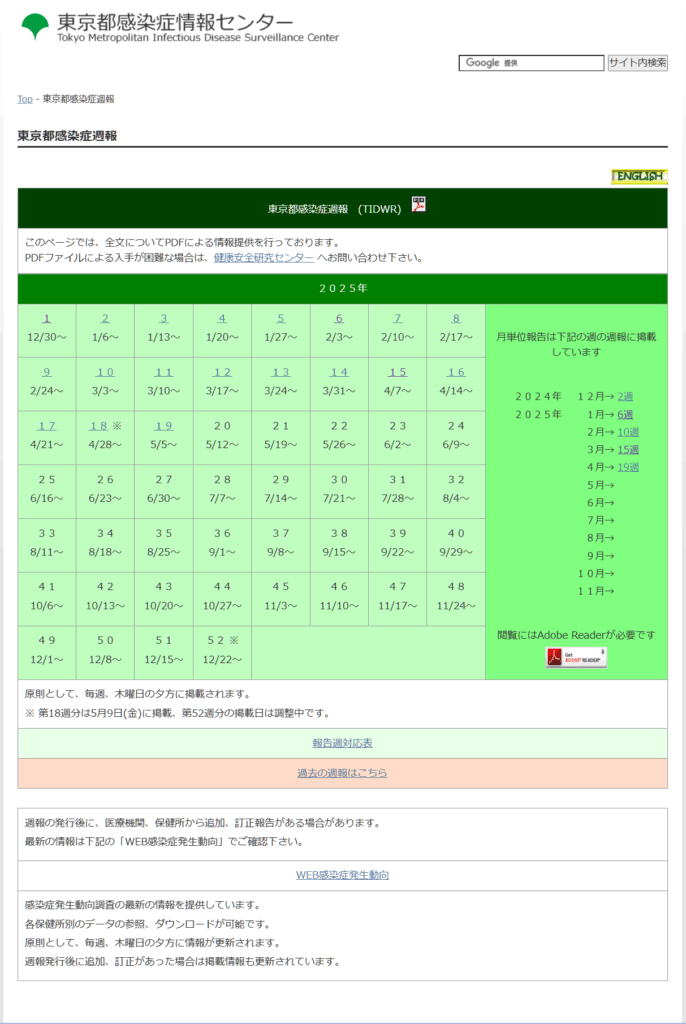 そこでたどり着いたのが、東京都感染症情報センターが発行している「感染症週報(TIDWR)」です。