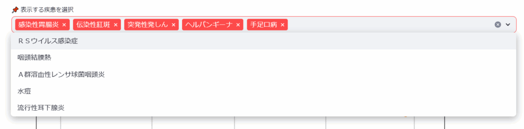 表示する疾患を選択のチェックボックスで感染症を選択すると、グラフに描画したい項目を選択できます。