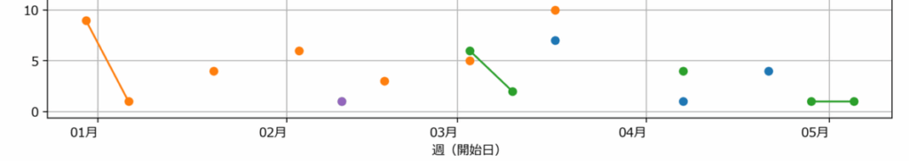 元データは第1週、第2週という週次での区切りとなっていますが、X軸には「1月」「2月」といった月表示を出し、時系列を直感的にわかりやすくします。ChatGPTとの対話により、適切な日付形式の選択やラベル配置も短時間で解決できました。
