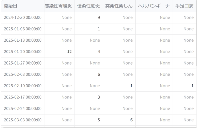 )を使ってPDF内のテキストを読み取り、正規表現で対象の感染症名と報告数を抽出しました。